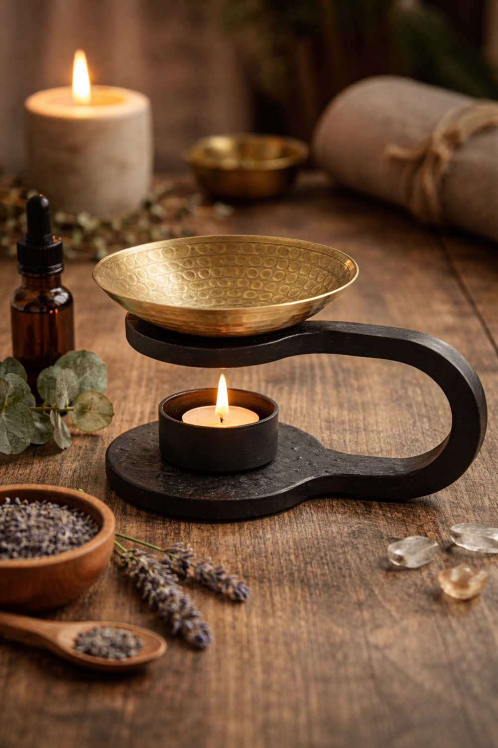 Le brûleur à mazout unique de style rustique est fabriqué à la main avec une base en fonte et un bol en cuivre martelé. Mettez de l'eau avec quelques gouttes de votre huile préférée avec une bougie chauffe-plat allumée en dessous pour parfumer toute la pièce.